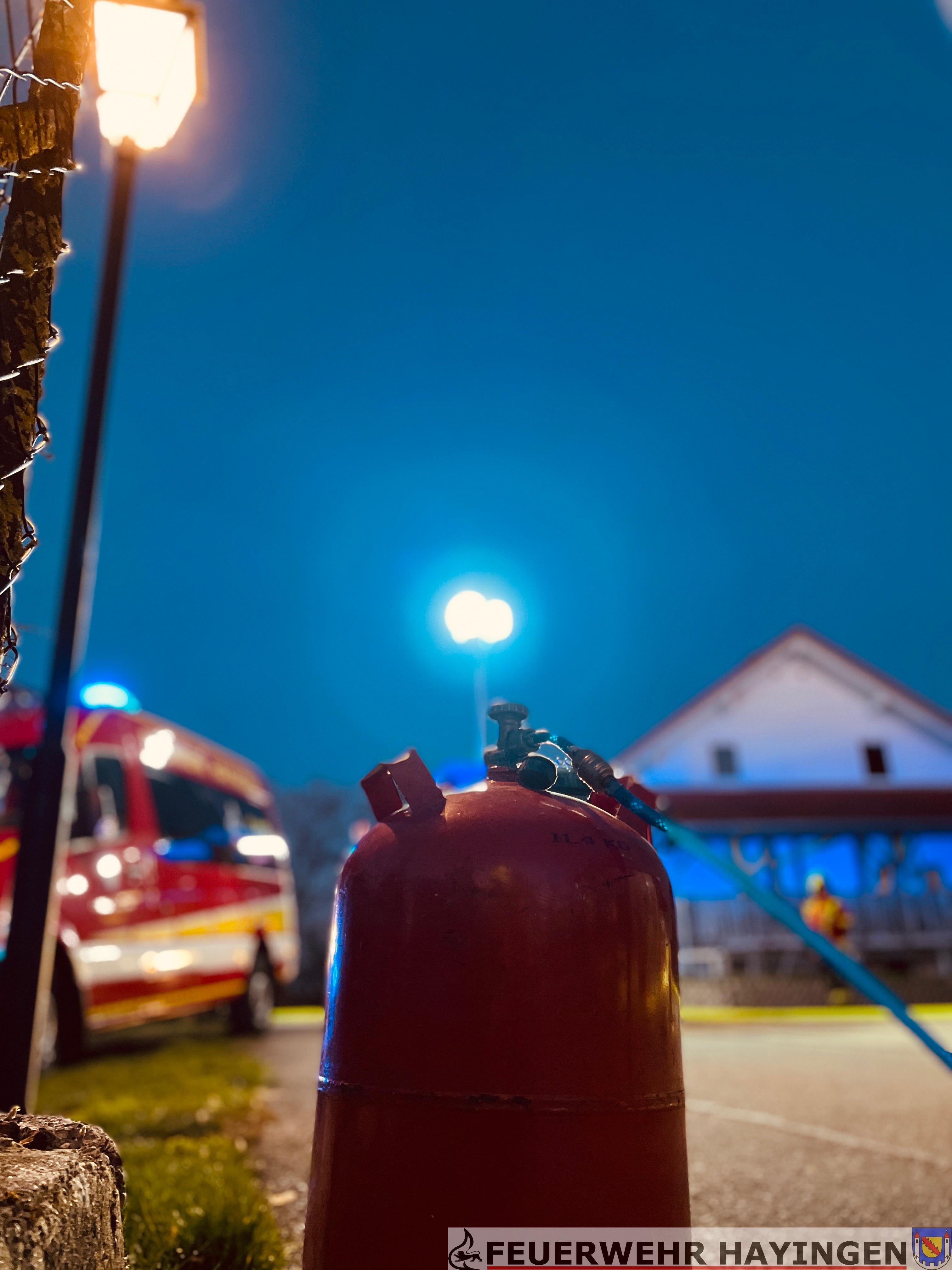 Szenario: Rauchentwicklung durch piepende Rauchmelder von Passant entdeckt - Person und abströmende Propangasflasche auf dem Weg zum Feuer, mit Vollendung durch Mayday-Lage.
